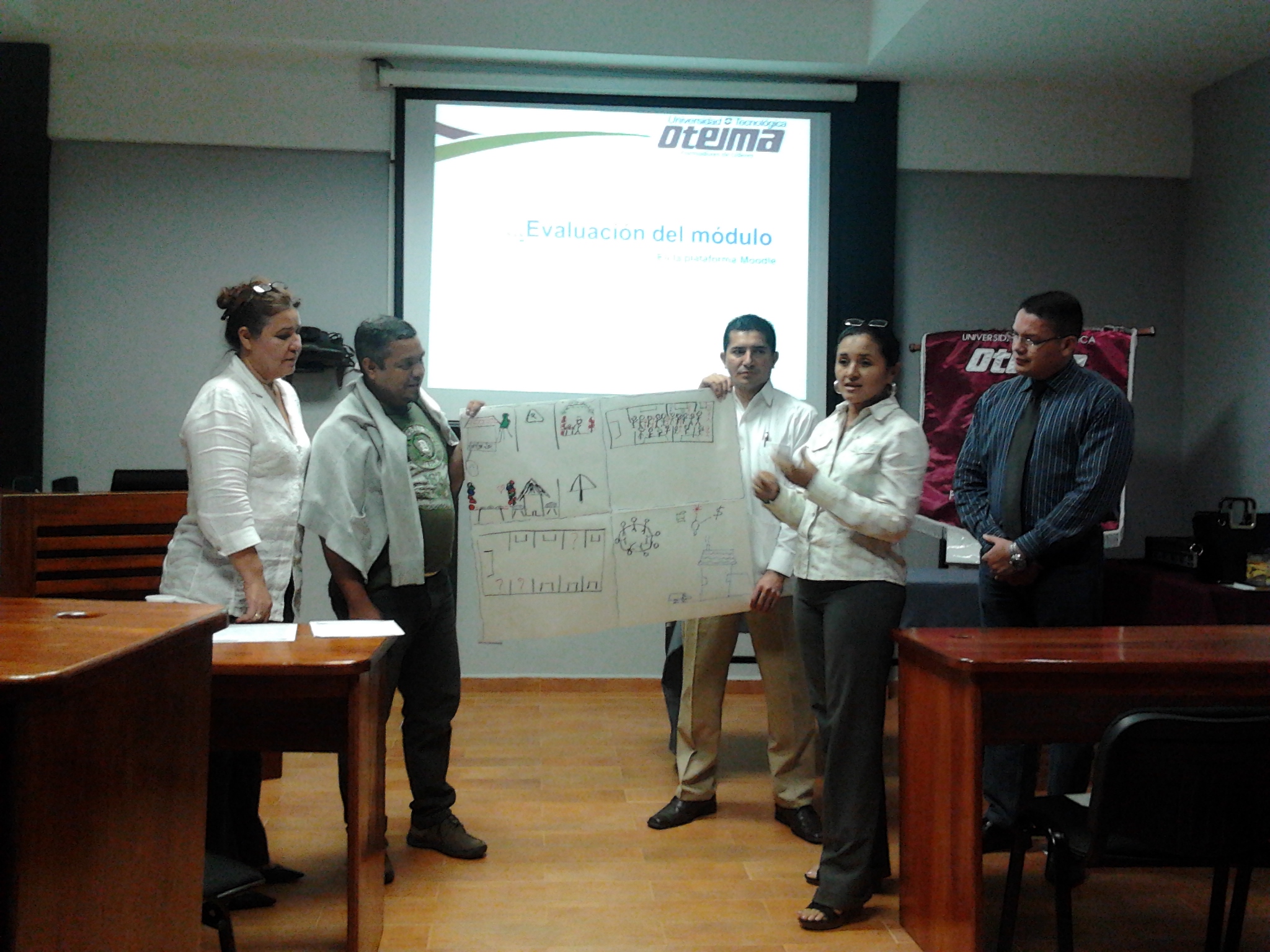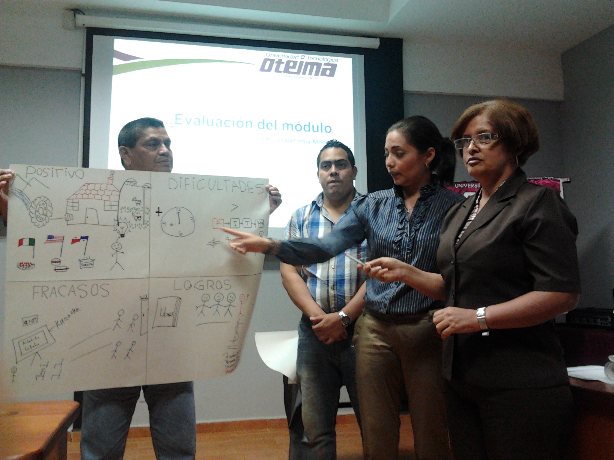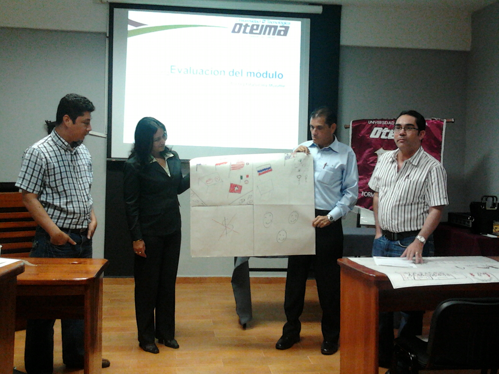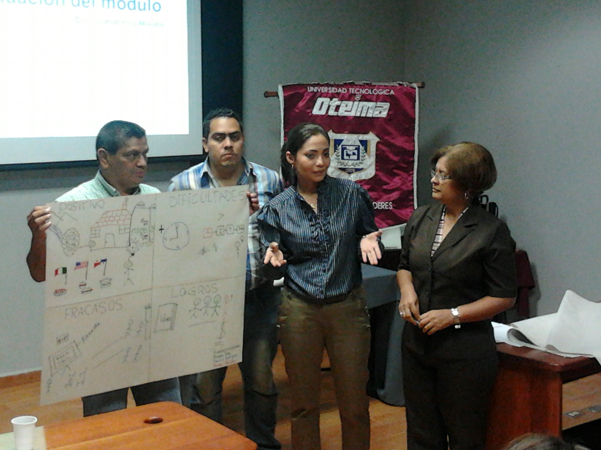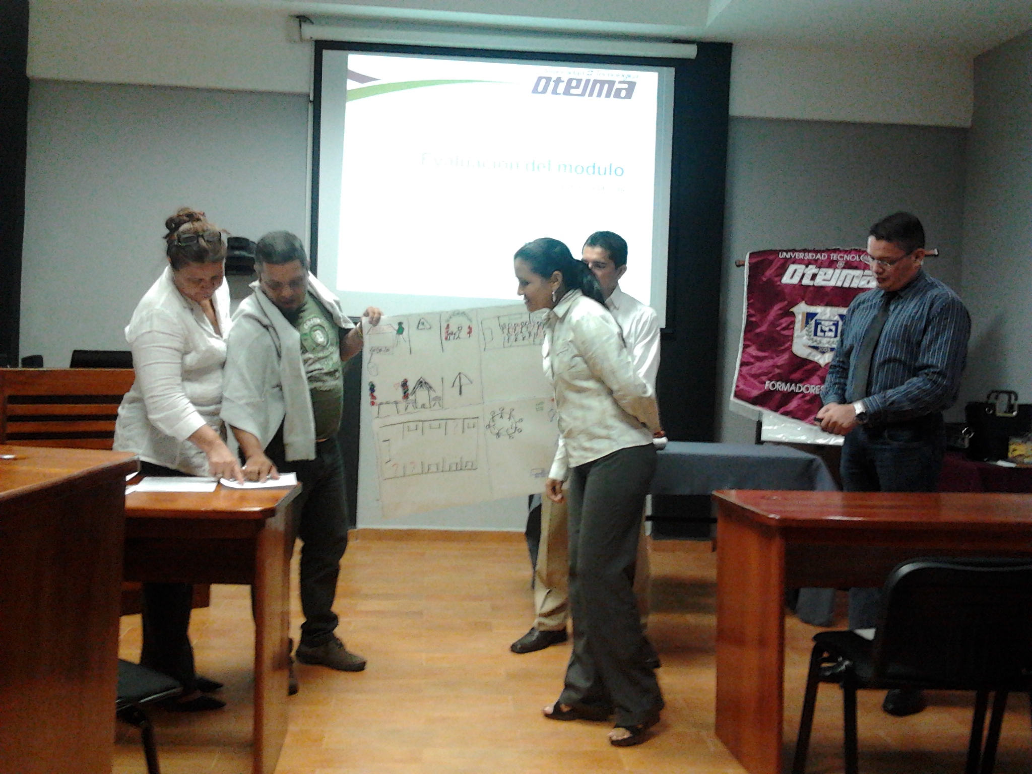 Los profesores de la Universidad Tecnológica Oteima se capacitan a través de los Cursos de Docencia Superior con actualización de 40 horas en temas de institucionalidad universitaria, desarrollo del módulo didáctico, estrategias metodológicas en el aula y plataforma Moodle. Aquí vemos el segundo grupo conformado mientras participan en talleres de trabajo y presentan resultados en la sesión. El segundo curso de Docencia Superior se realiza del 23 de noviembre al 21 de diciembre de 2012, en la Sala de Maestrías y Doctorado El Inmigrante Ideal de la Universidad Tecnológica Oteima.