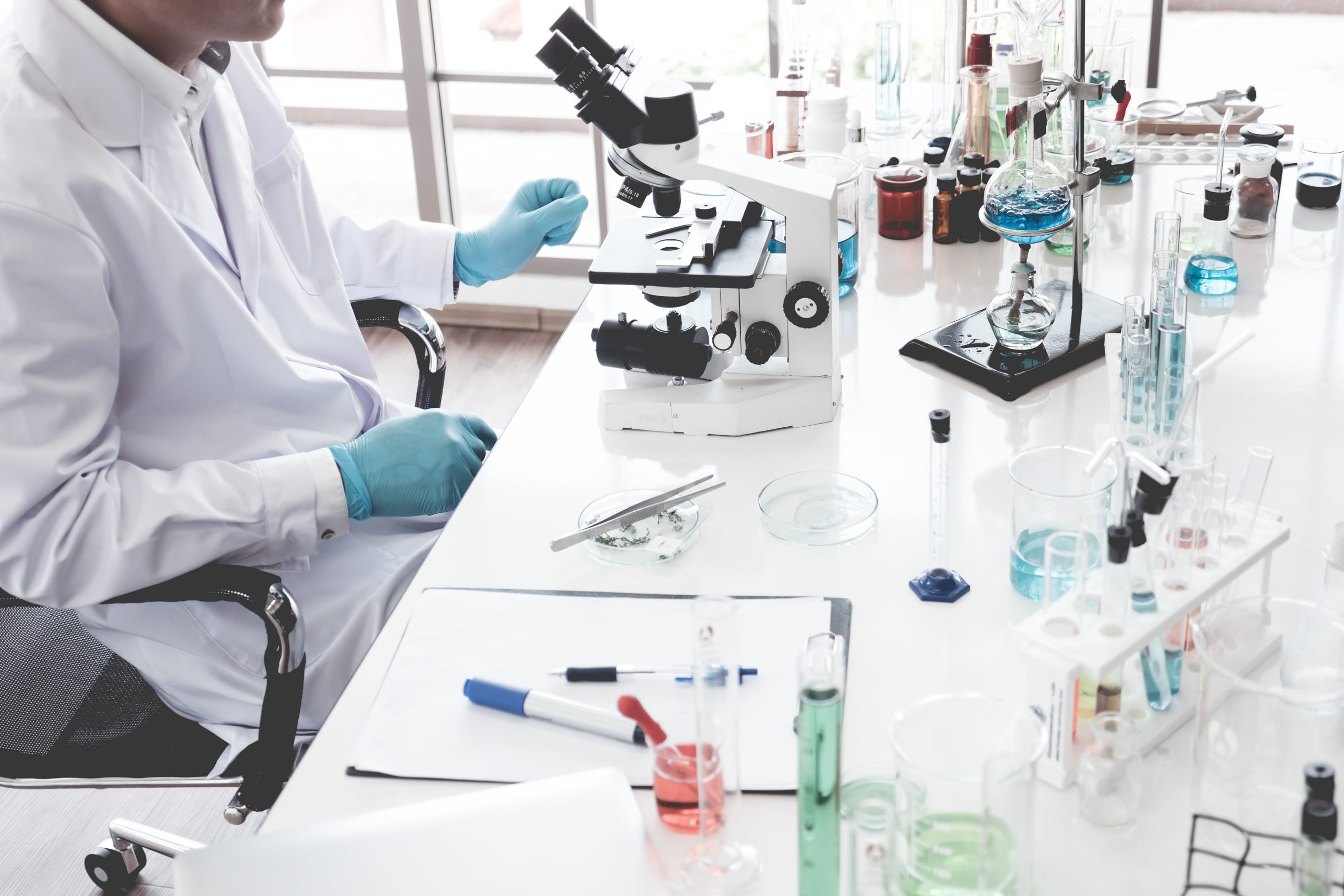 - Scientist doing some research and looking through a microscope in a laboratory