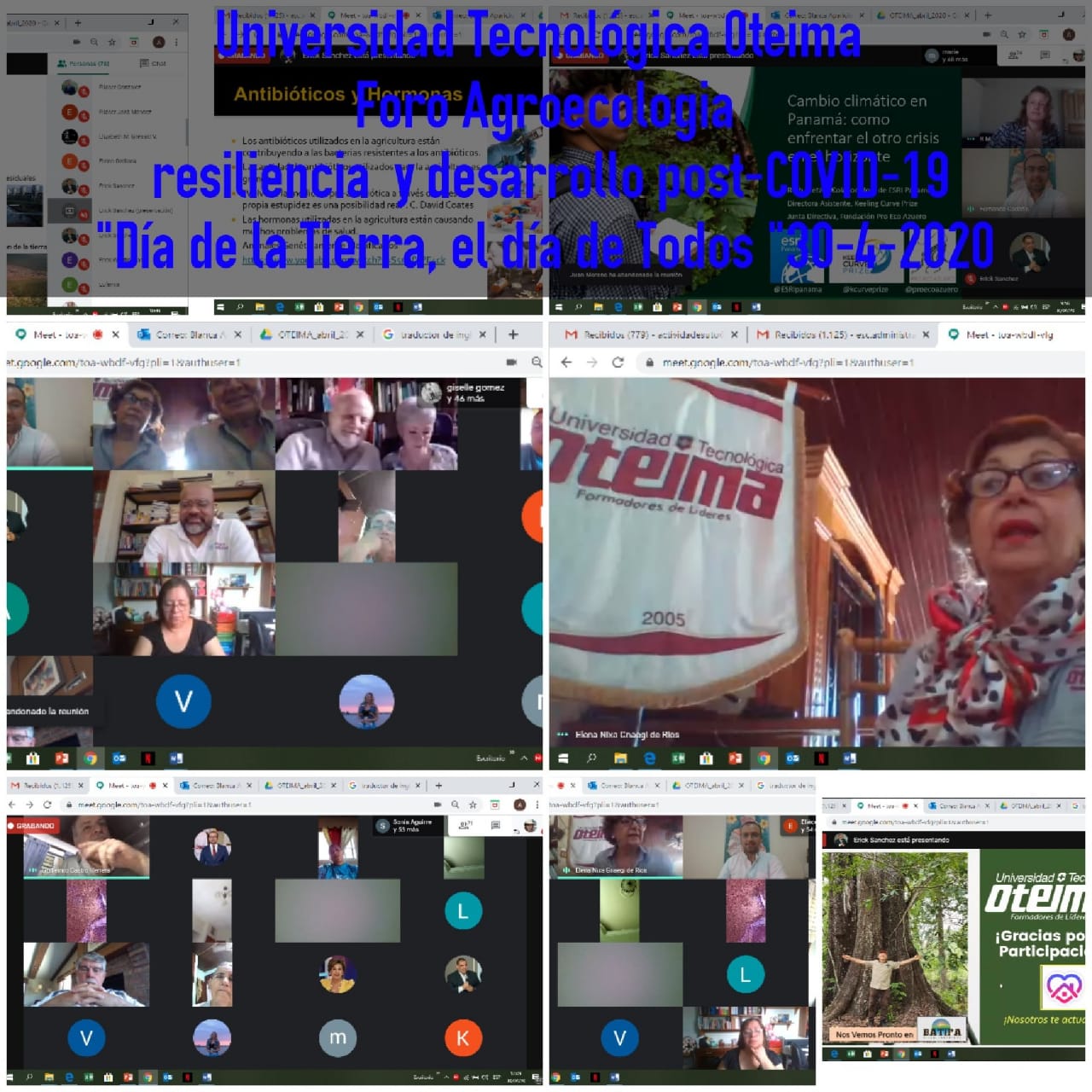 30 de abril de 2020 Foro: Agroecología resiliencia y desarrollo post-COVID-19″Día de la Tierra, el Día de Todos «, actividad que la Universidad Tecnológica Oteima, ejecutó en modalidad MEET-100% Internet-evento dirigido a estudiantes, profesores, profesionales ,comunidad en general y participantes de U.S.A . A las 9:50a.m., iniciamos el programa, con la bienvenida de la Rectora-Nixa Gnaegi de Ríos y la invocación religiosa por medio de un vídeo incorporado del Cardenal José Luis Lacunza. Se contó con apreciable cantidad de seguidores del Foro, en conocer sobre los temas de manera virtual expuesto por los doctores: Juan Moreno-CIDES, Ruth Metzel ESRI Pro Azuero, Bruno Borsari Winona University U.S.A., Lourdes Lozano-Fundación Imaginari y Guillermo Castro Ciudad del Saber. Los tiempo se cumplieron según el programa, la participación de los expositores lleno las expectativas. Despertando el interés y participación con excelentes preguntas. El evento fue exitoso, gracias al equipo Oteimoso.