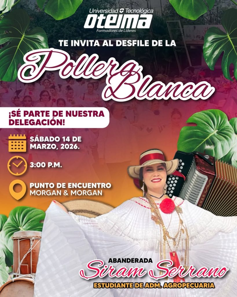 La Universidad Tecnológica Oteima te invita a ser parte del majestuoso Desfile de la Pollera Blanca el sábado 14 de marzo de 2026 a las 3:00 p.m.