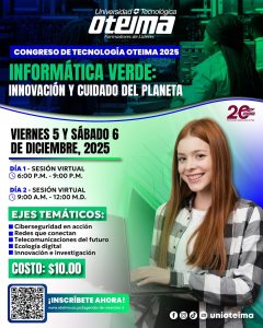 Prepárate para ser parte del Congreso de Tecnología OTEIMA 2025: “Informática Verde: Innovación y Cuidado del Planeta” 🌱✨🌍💻 🔹 Cuándo: Viernes 5 y sábado 6 de diciembre (modalidad virtual) 🔹 Temas que te inspirarán: 💠 Ciberseguridad en acción 💠 Redes que conectan 💠 Ecología digital 💠 Telecomunicaciones del futuro 💠 Innovación e investigación Costo: $10.00🎟️ […]