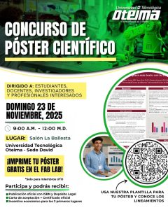 Lineamientos del Concurso El Congreso de Investigación OTEIMA 2025 se llevará a cabo el 22 y 23 de noviembre, destacando el Concurso de Póster Científico en modalidad presencial. Este es un espacio que impulsa la innovación, el pensamiento crítico y la investigación con propósito.📚 El llamado está dirigido a estudiantes, docentes e investigadores de todas […]
